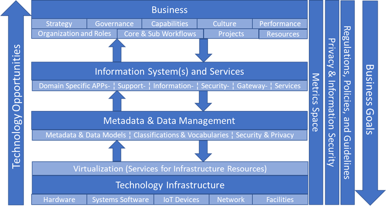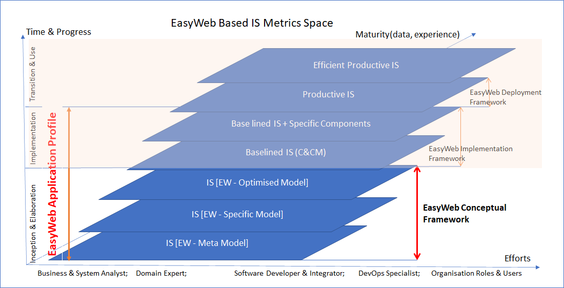 EasyWeb conceptual framework serves as a “Meta-Model” out of each the targeted IS and Organization are defined as a specialized problem to be solved. The model is used to access the current working environment of the targeted organization, and as well to define the vision for the new or enhancements of an existing system. This model, in a “static view”, defines the problem in terms of organizations and organizational structures, people and their roles, tasks and activities they perform, Information Items or entities of their responsibility, metadata and data for information items, subject topics, controlled vocabularies, technologies & software in use or to be used, work guidelines, policies, regulations, and check points, performance and progress indicators, relevant metrics, benchmarking, etc.